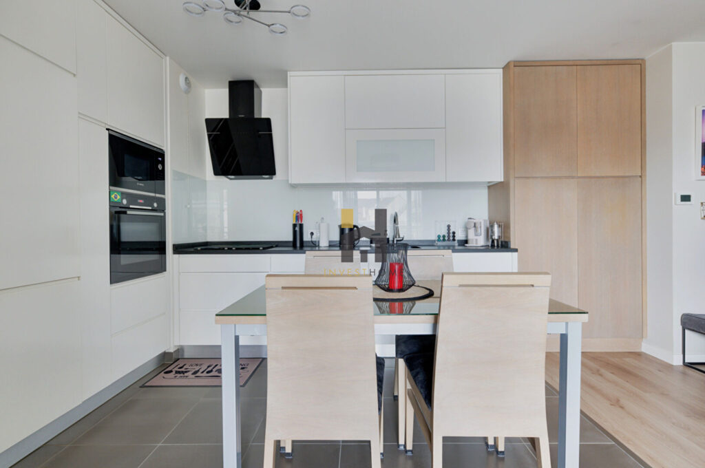 La cuisine, entièrement équipée et réalisée sur mesure, s’intègre harmonieusement à l’espace de vie et apporte une signature élégante.